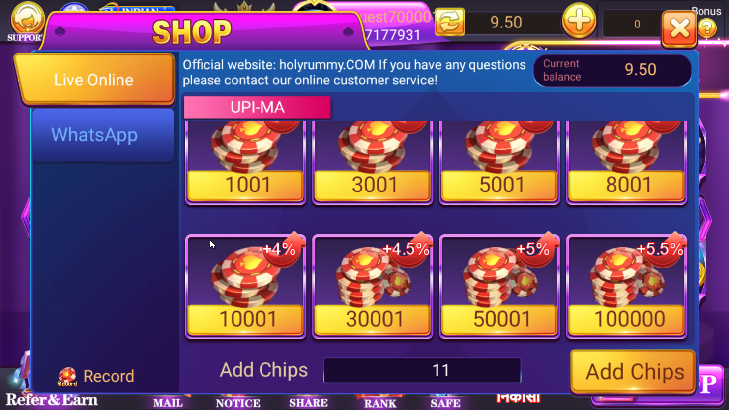 Choose your Chip Pack. The ratio is 1:1, which means you pay ₹ 1, your balance is credited 1 chip.